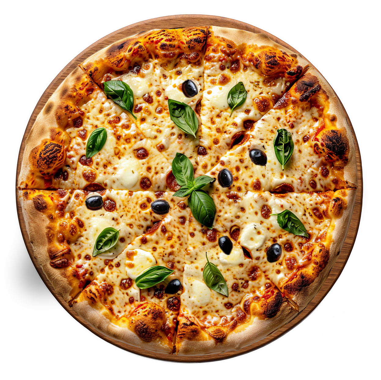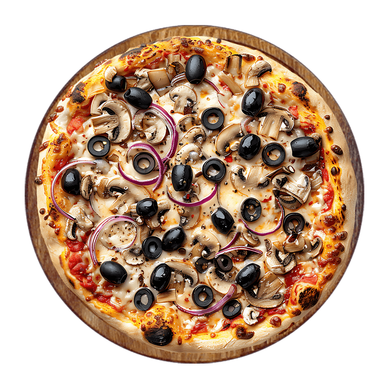Sauce tomate basilic, mozzarella, oignons, champignons, tomates fraîche, olives.