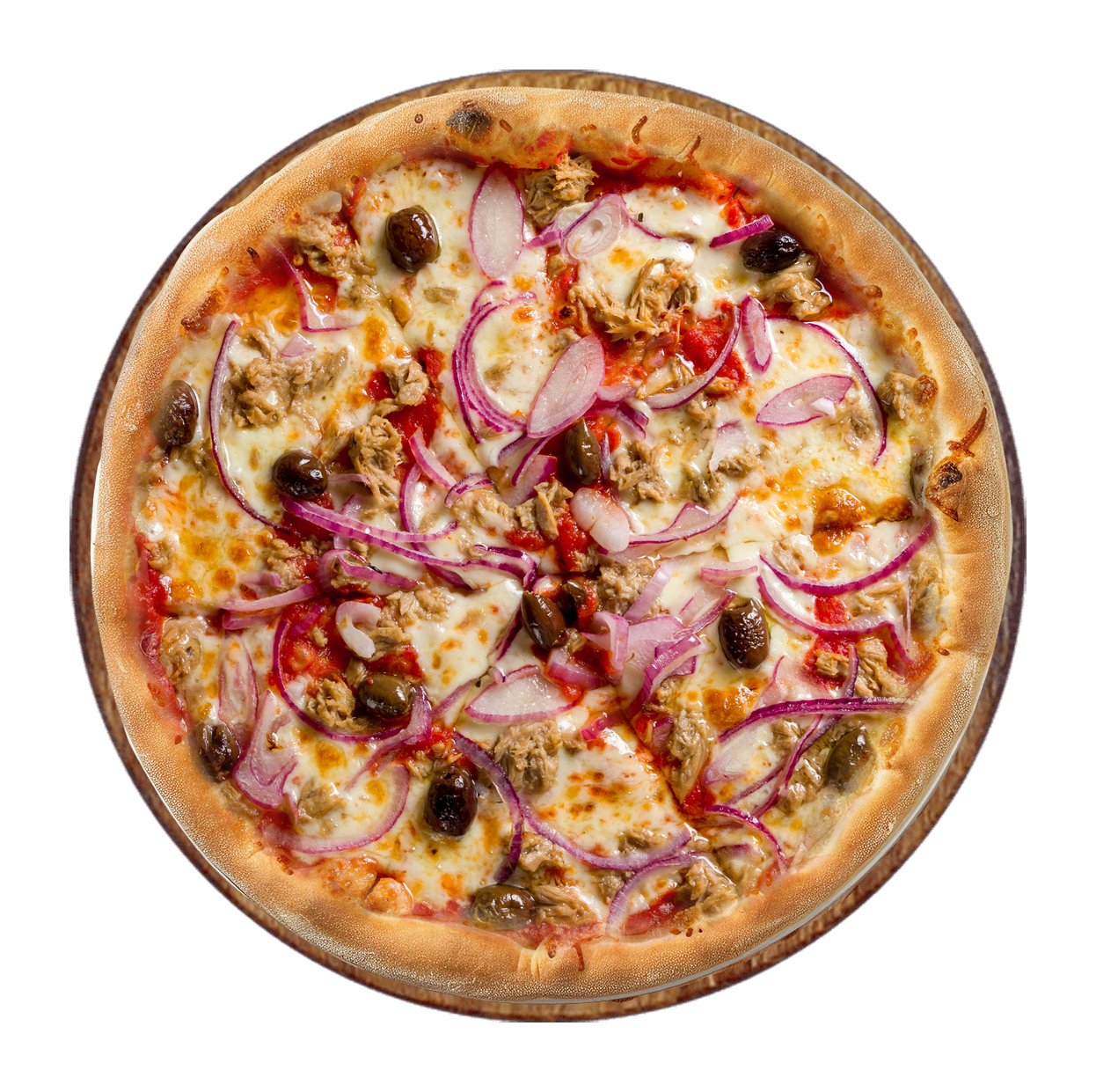 Sauce tomate basilic, mozzarella, thon, oignons, olives.