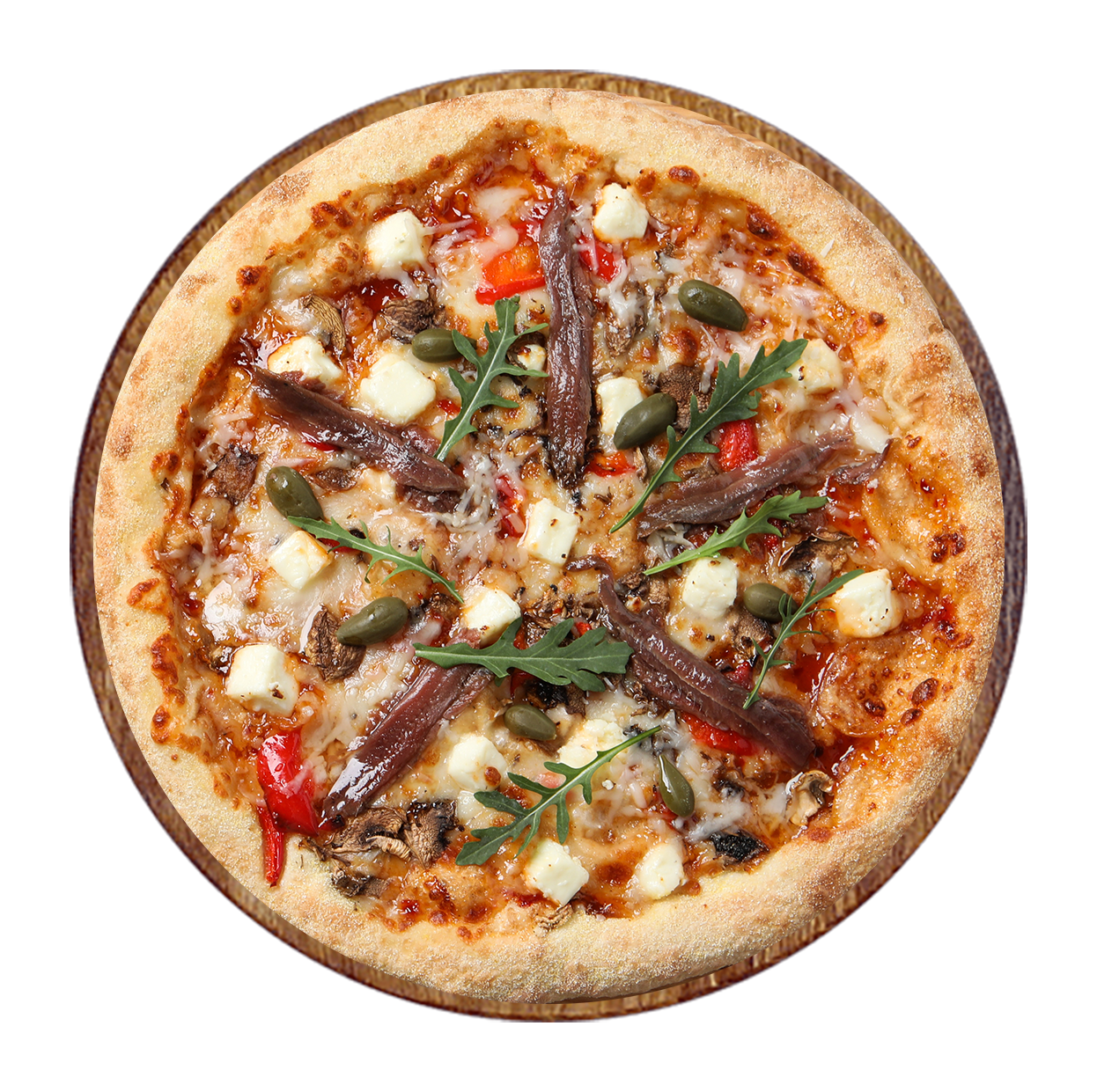 Sauce tomate basilic, mozzarella, anchois, câpre, olives.