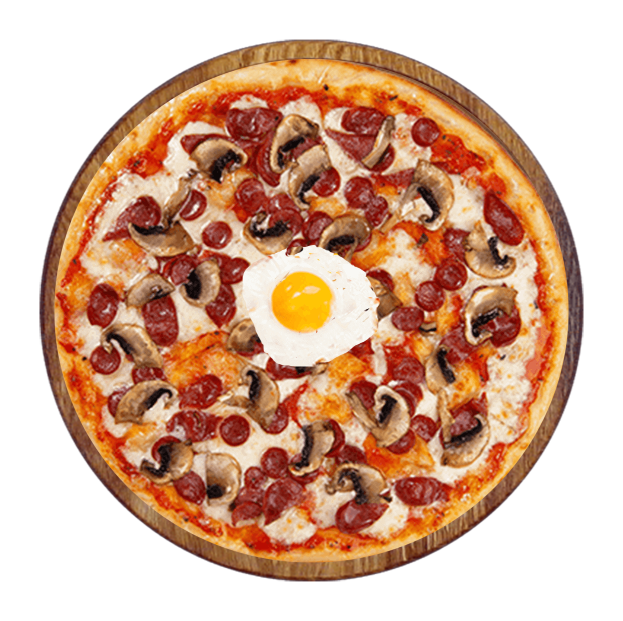 Sauce tomate basilic, mozzarella, merguez, oeuf, champignons, olives.