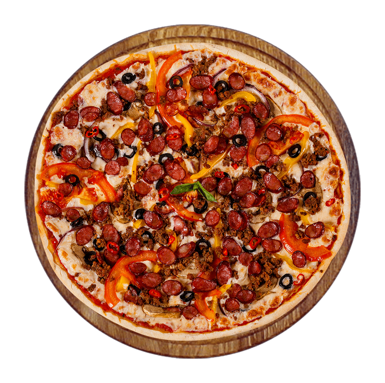 Sauce tomate basilic, mozzarella, merguez, viande hachée, poulet, olives.