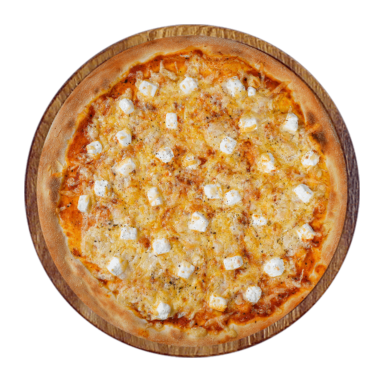 Sauce tomate basilic, mozzarella, chèvre, reblochon, camembert.