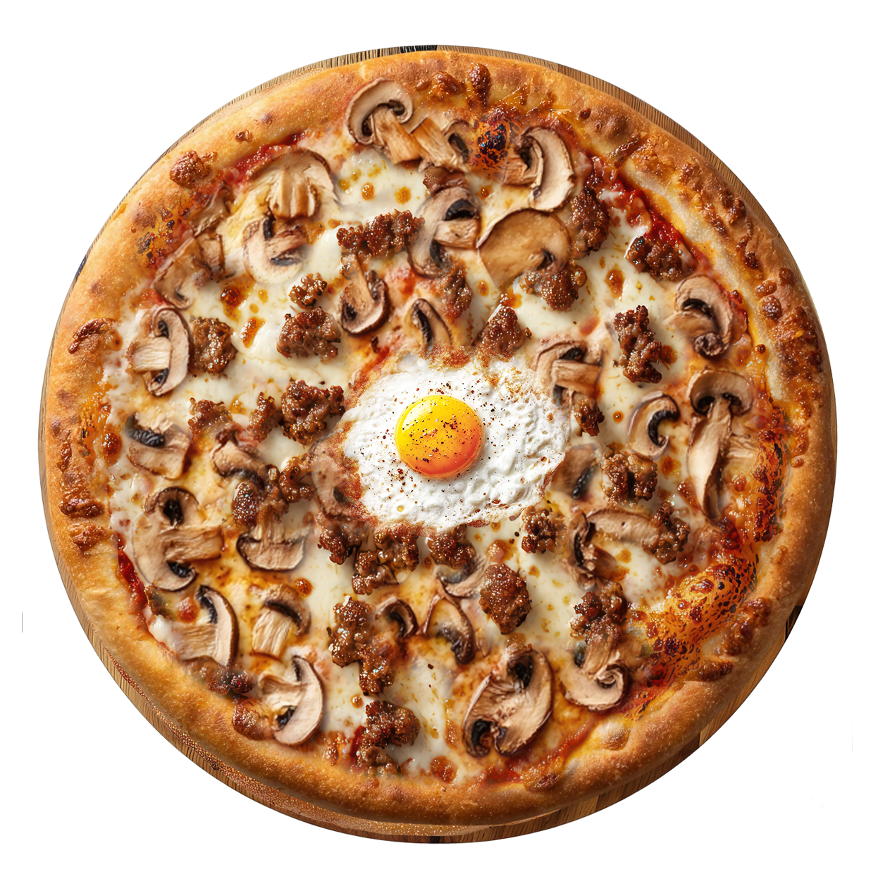 Sauce tomate basilic, mozzarella, viande hachée, oeuf, champignons, olives.